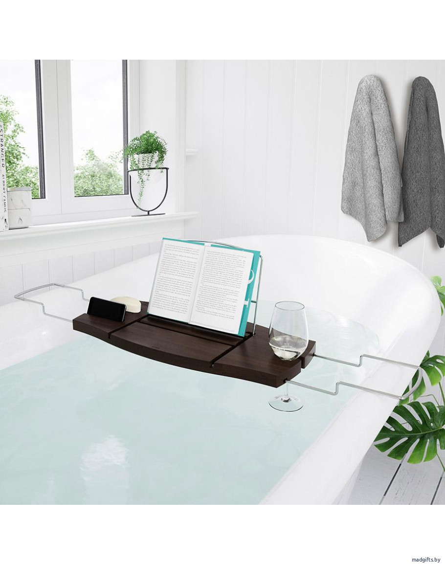 Полка оснащена встроенной мыльницей, прорезью для бокала с вином, подставкой для книги или iPad, отверстием для телефона и держателем для бритвенного станка. Аксессуар выполнен из экологически чистого бамбука, который отличается стойкостью к повышенной влажности. Благодаря выдвижным хромированным кронштейнам полку можно устанавливать на любую ванную шириной до 94 см.