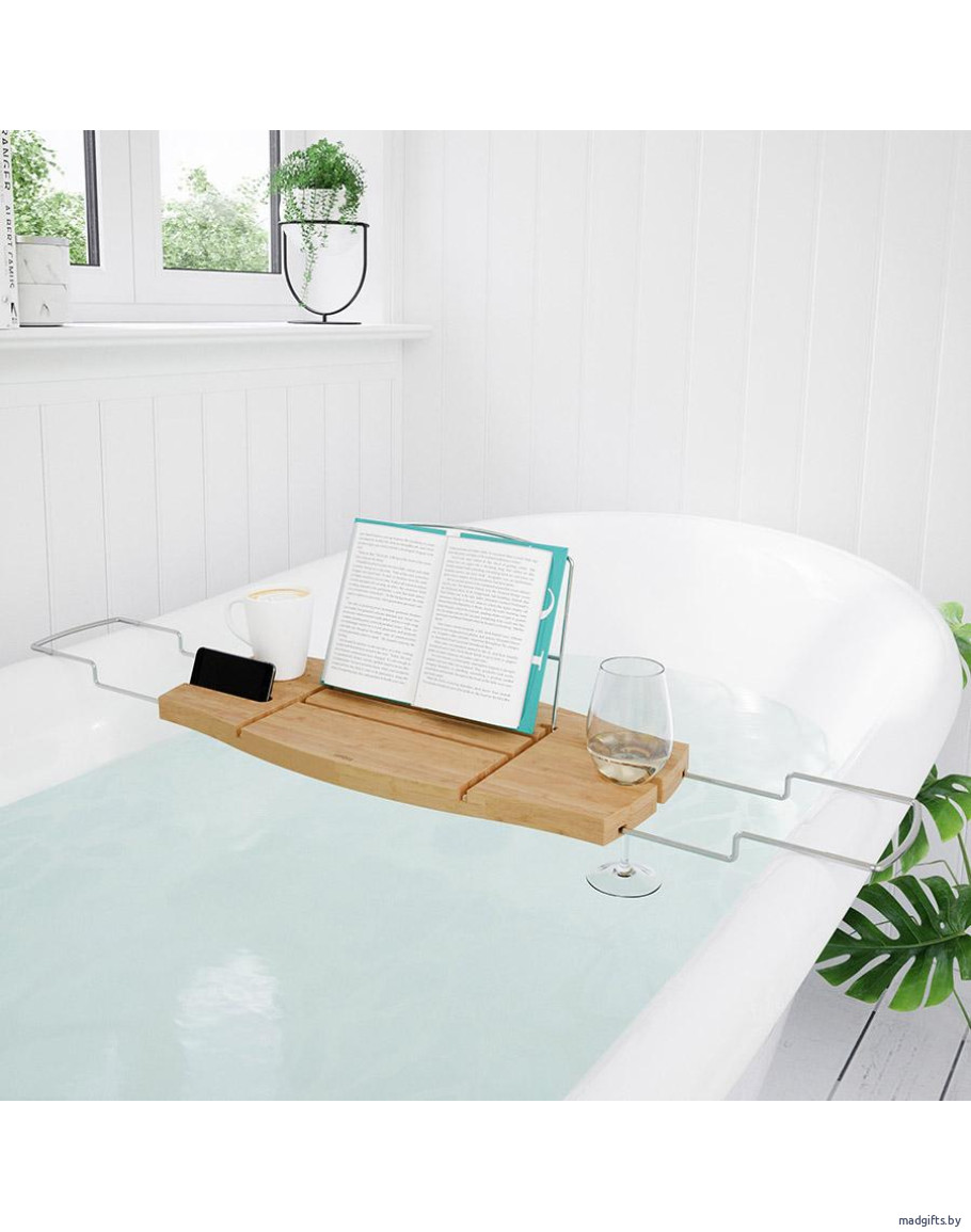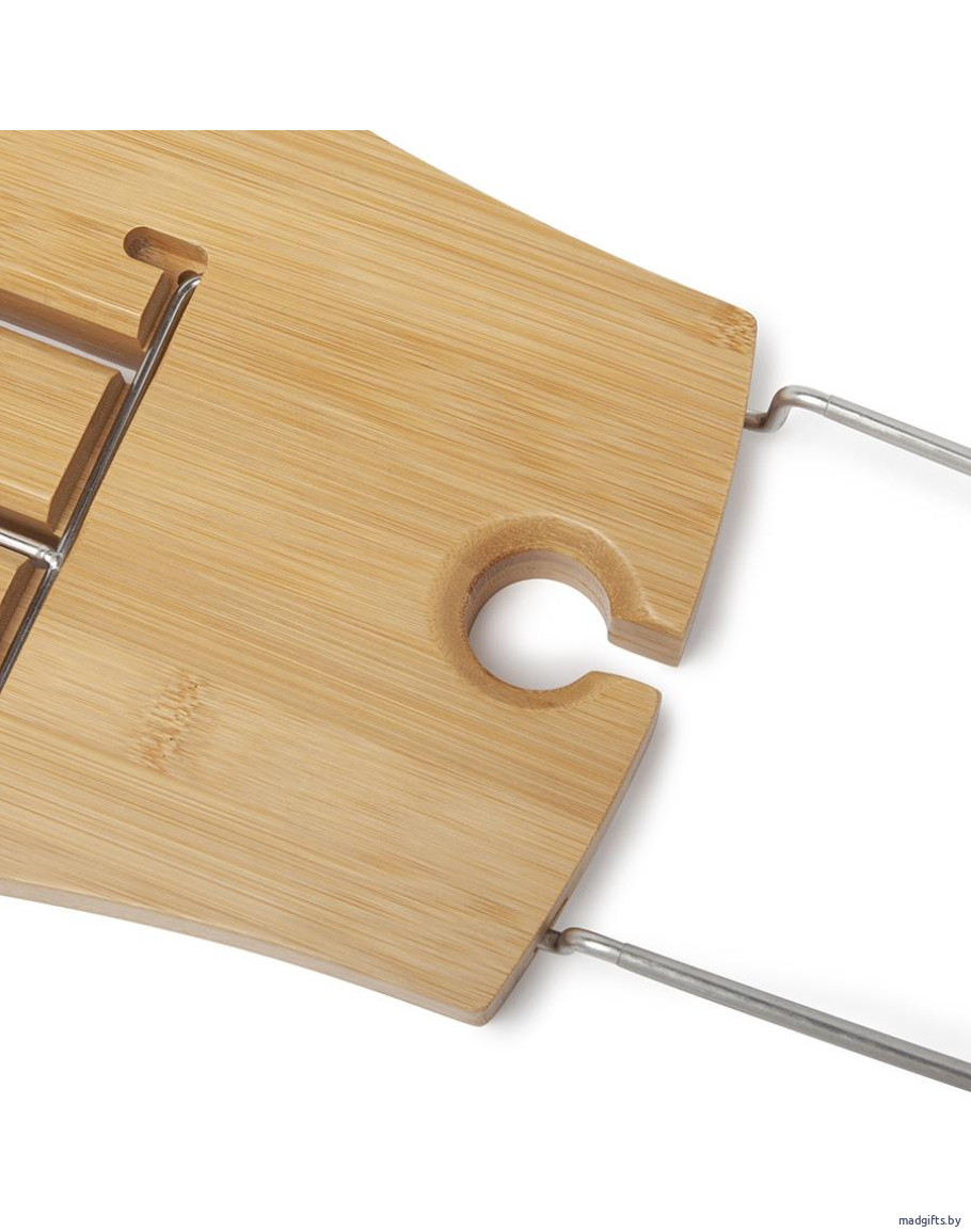 Полка оснащена встроенной мыльницей, прорезью для бокала с вином, подставкой для книги или iPad, отверстием для телефона и держателем для бритвенного станка. Аксессуар выполнен из экологически чистого бамбука, который отличается стойкостью к повышенной влажности. Благодаря выдвижным хромированным кронштейнам полку можно устанавливать на любую ванную шириной до 94 см.