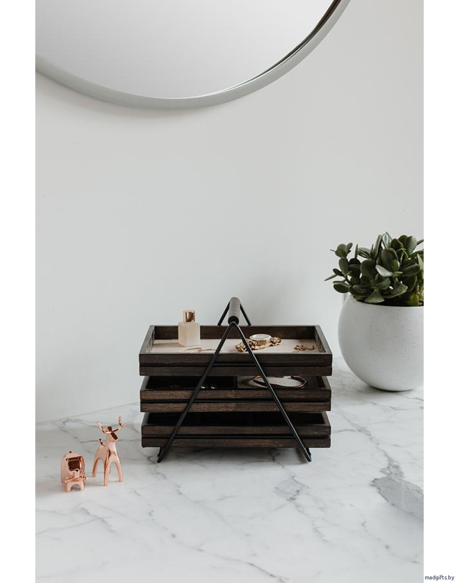 Деревянная многоярусная шкатулка позаботится о ваших украшениях. Благородное сочетание натурального темного дерева и металла с черным матовым покрытием делает шкатулку отличным подарком как для женщины, так и для мужчины.